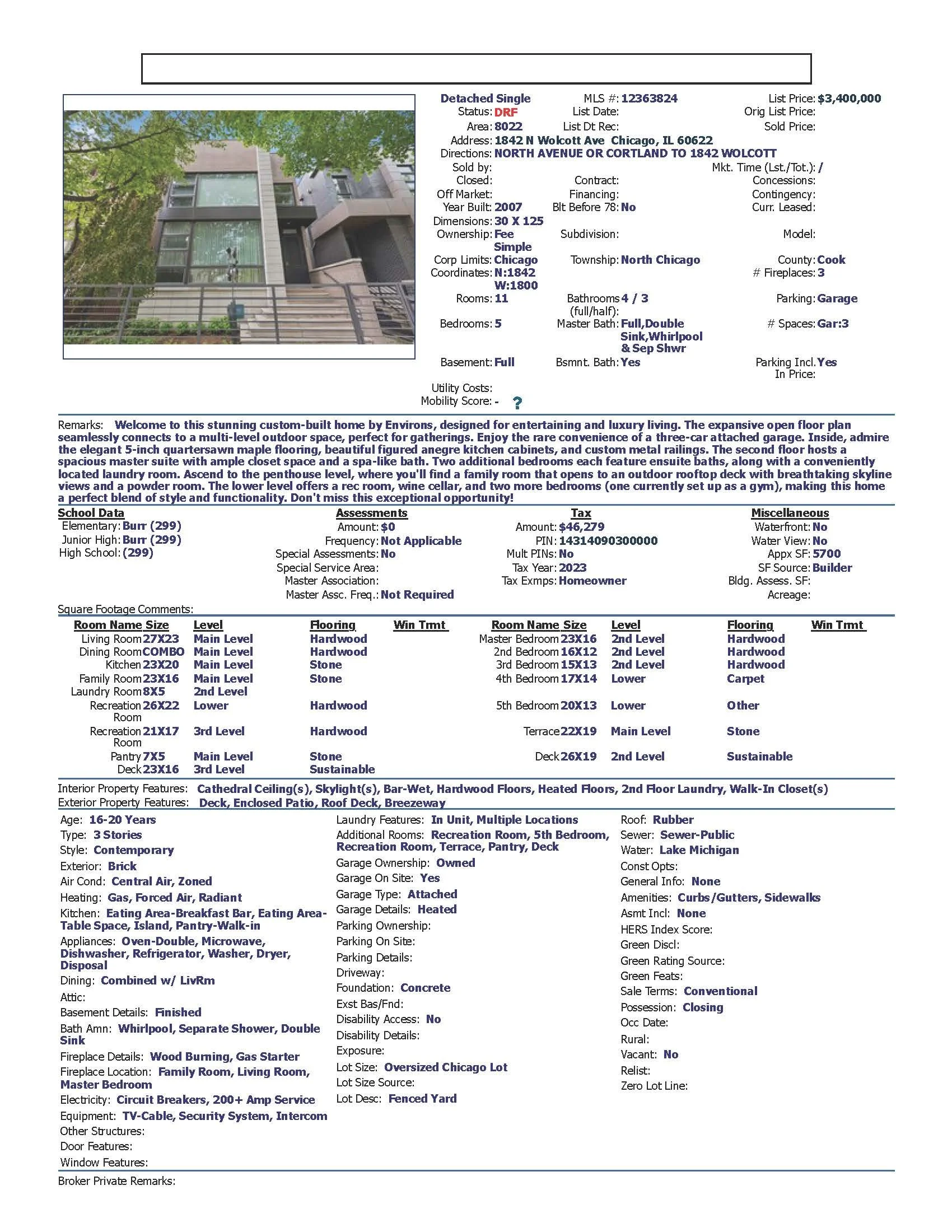 A masterful expression of contemporary design, this all-brick Environs residence sits on a wide 30' lot along one of Bucktown's most coveted blocks. Unique features include a dramatic two-story foyer, 5-inch quartersawn maple floors, custom railing sets, and a sun-filled living room with a fireplace. The contemporary kitchen features custom anegre cabinetry, a 48" Sub-Zero refrigerator, Dacor double ovens and a 48" cooktop, Bosch dishwasher, Fisher & Paykel dishwasher drawers, integrated wine refrigeration, a walk-in pantry, and a built-in breakfast nook. The expansive great room, highlighted by soaring 14' ceilings and a fireplace, opens effortlessly to an exquisitely landscaped patio, perfect for seamless indoor/outdoor entertaining, with direct access to the garage rooftop. A breezeway/mudroom with built-in storage and seating connects to the attached, heated three-car garage. The second level offers a luxurious primary suite with three walk-in closets and a spa-inspired bath featuring heated floors, illuminated mirrors, an oversized shower, and a soaking tub. Two additional bedrooms each feature en-suite baths, complemented by a full laundry room. The sun-drenched top-floor penthouse retreat includes a wet bar and a powder room and opens to a spectacular rooftop deck with breathtaking views. The lower level is equally impressive, offering a generous recreation room, wine cellar, wet bar, heated floors, and two additional bedrooms, one currently styled as a private fitness studio. Ideally positioned near the 606 Trail, I-90/94, Metra, Churchill and Walsh Parks, and Bucktown's premier boutiques and dining, this exceptional residence delivers luxury living at its finest.