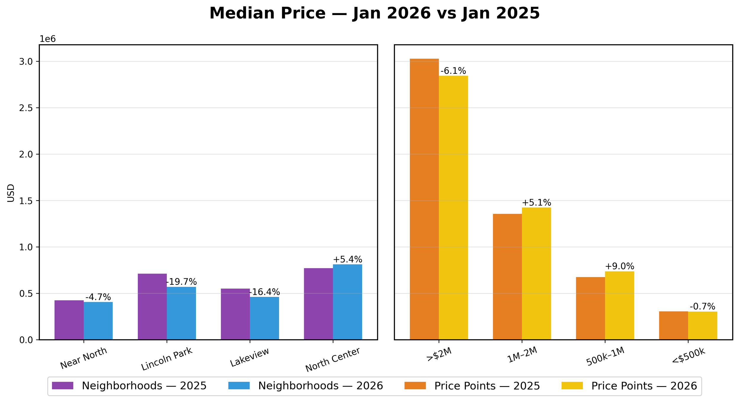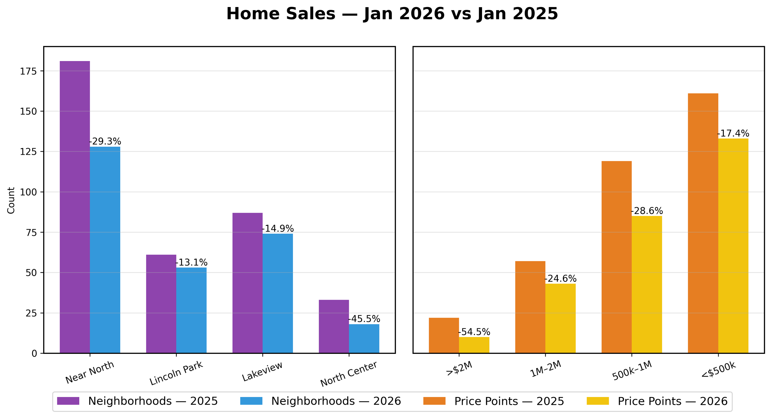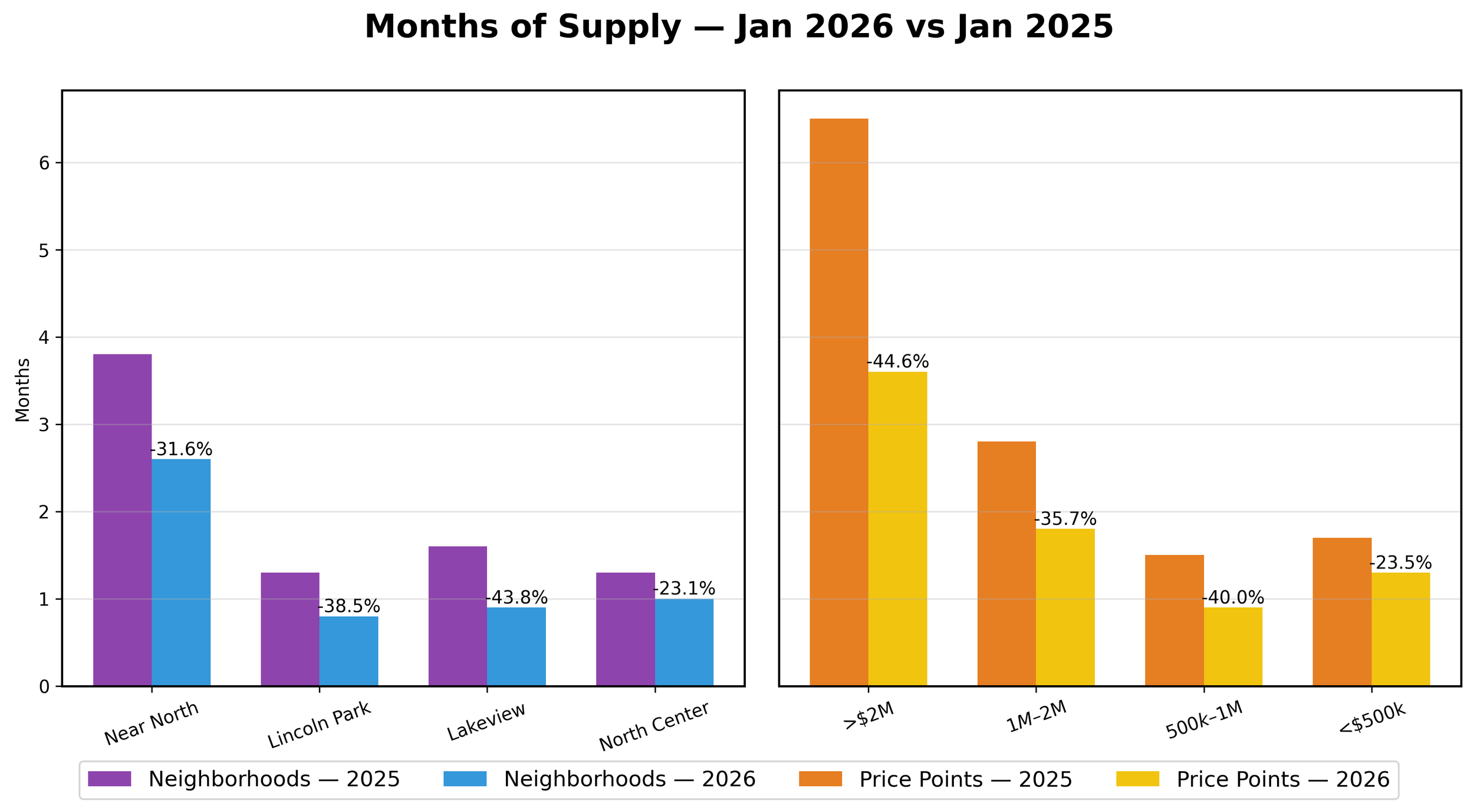 Months of supply of inventory in January 2026 also fell 35.0% to 1.3 MSI vs 2025. Lincoln Park, Lakeview and North Center dropped to below 1.0 MSI for the first time.