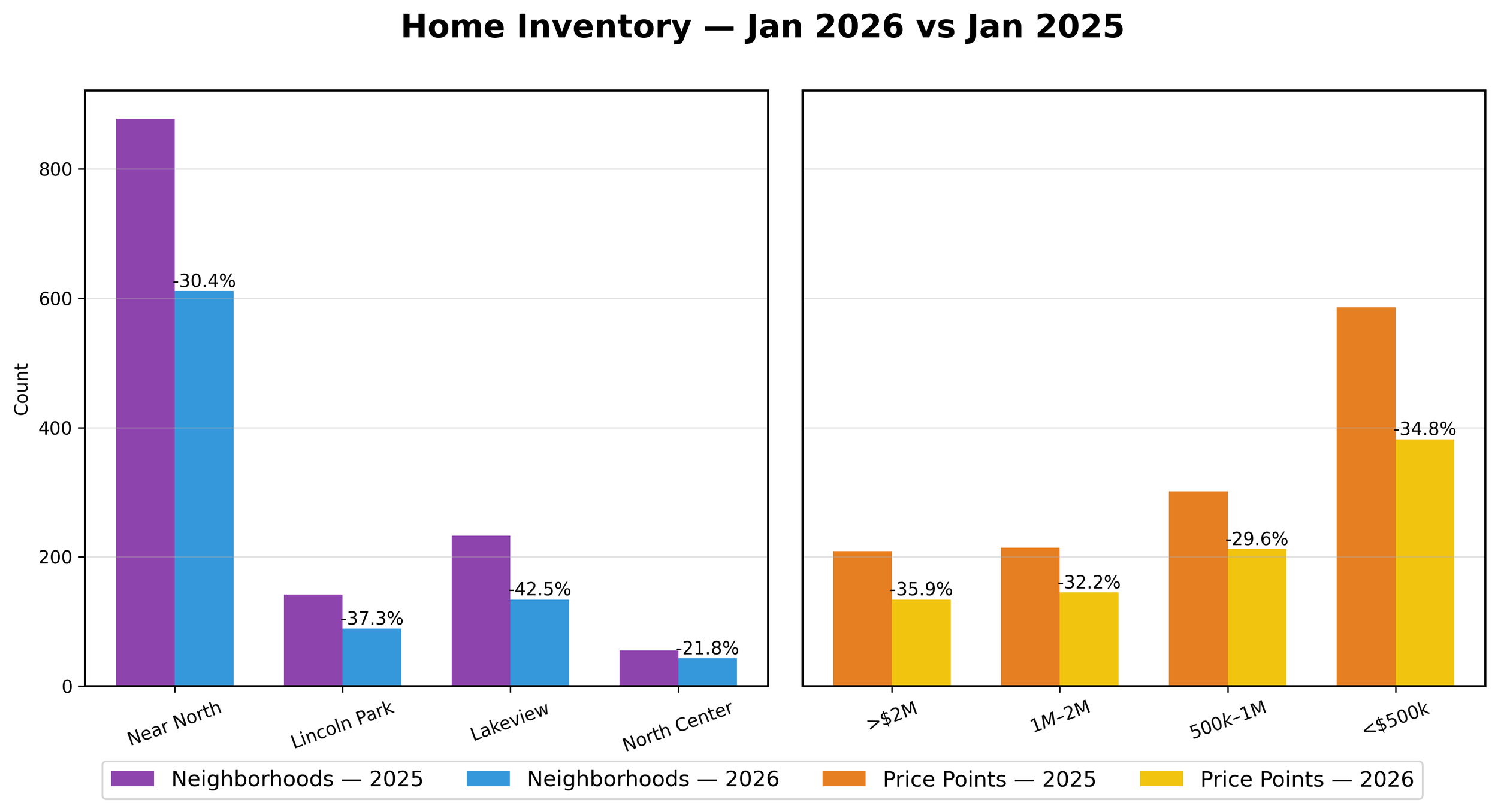 January 2026 Inventory levels dropped in all four neighborhoods by 33.5% vs 2025