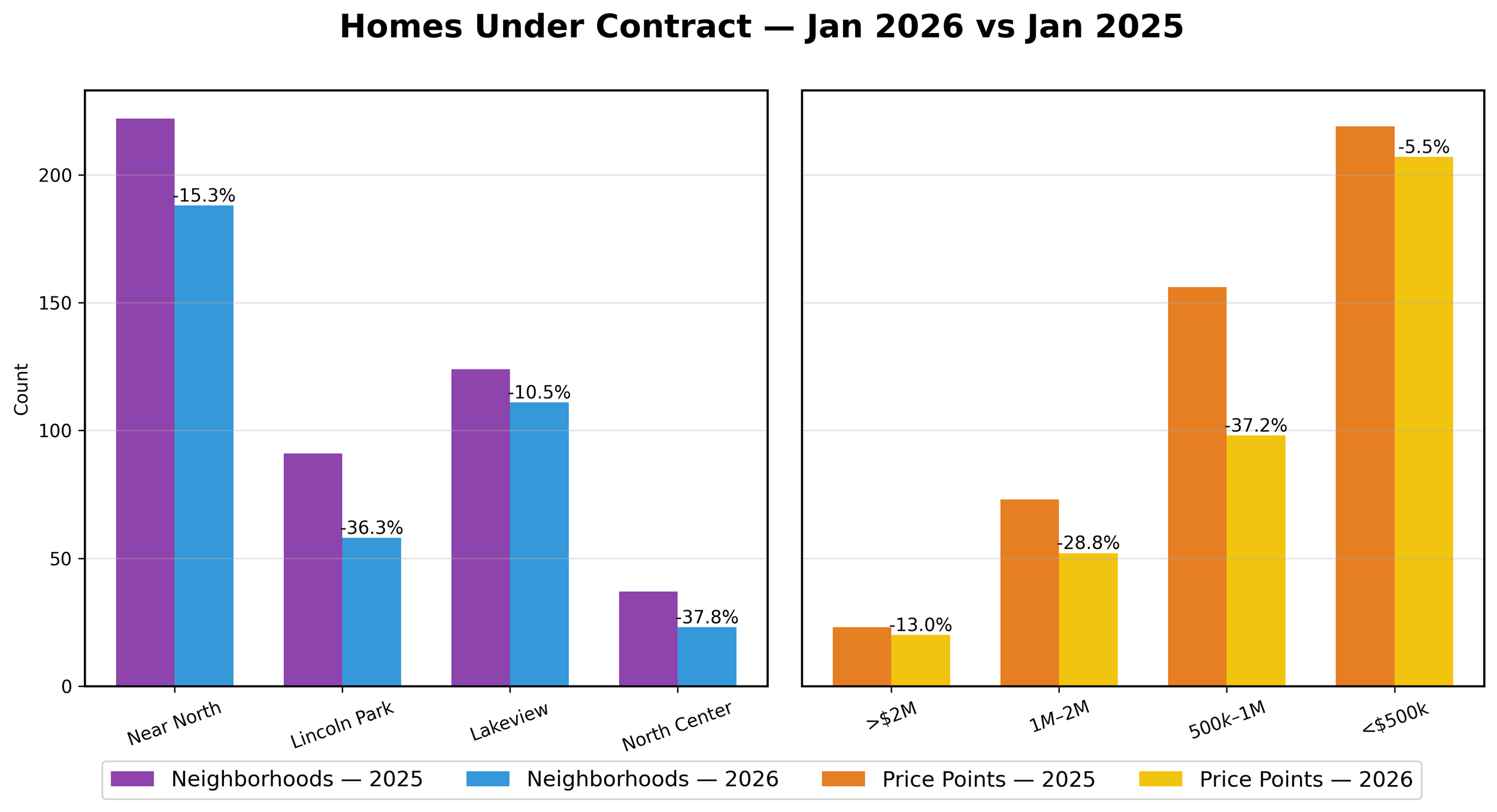 The historically low inventory levels on Chicago’s North Side took their toll on January 2026 home sales, which fell 24.6% vs 2025. Homes that went under contract in January 2026 also fell 19.8% vs 2025.
