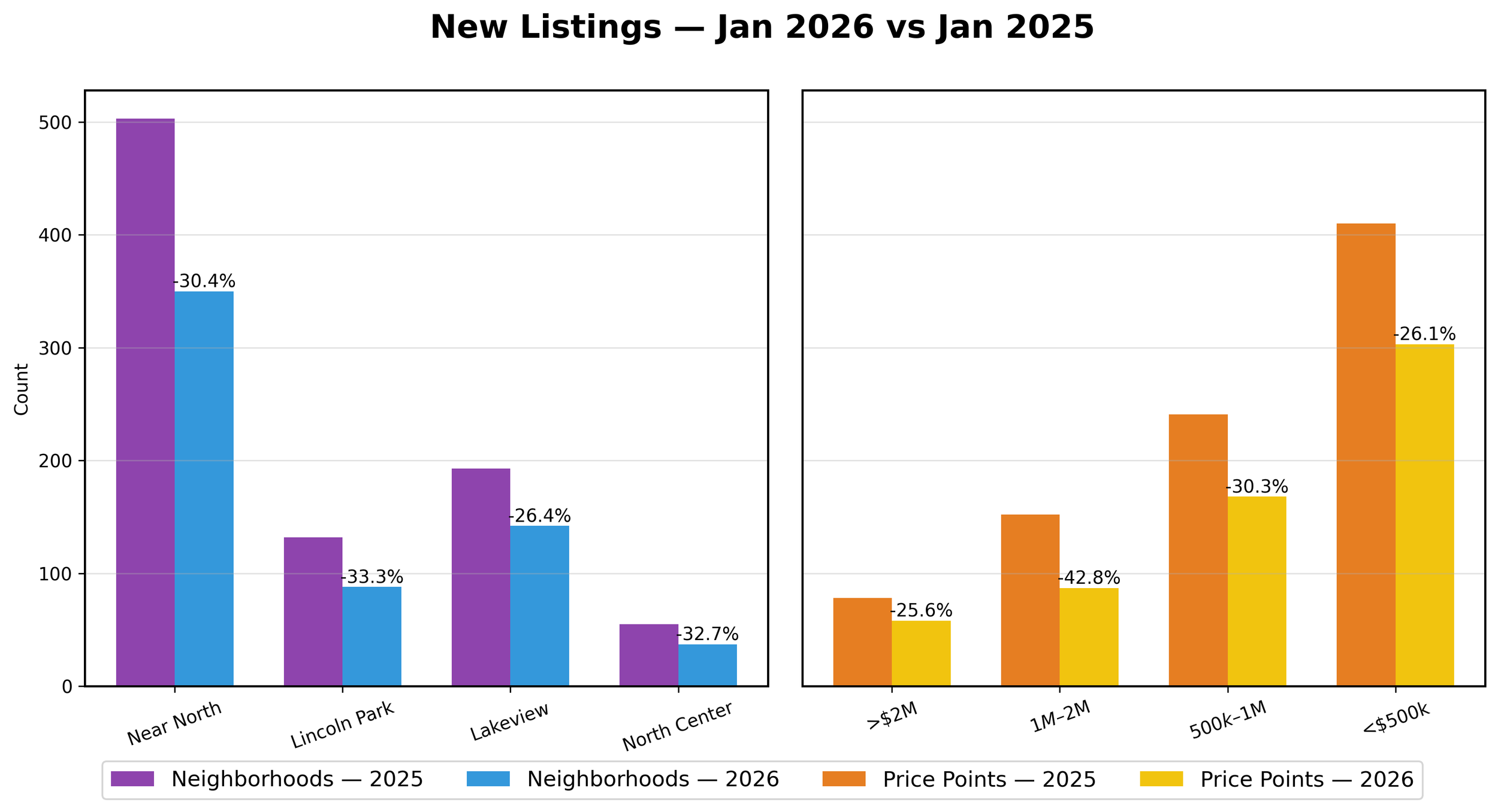 January 2026 New Listings were down 30.1% overall (883 vs 617). Near North accounted for over half of the new listings with 350.