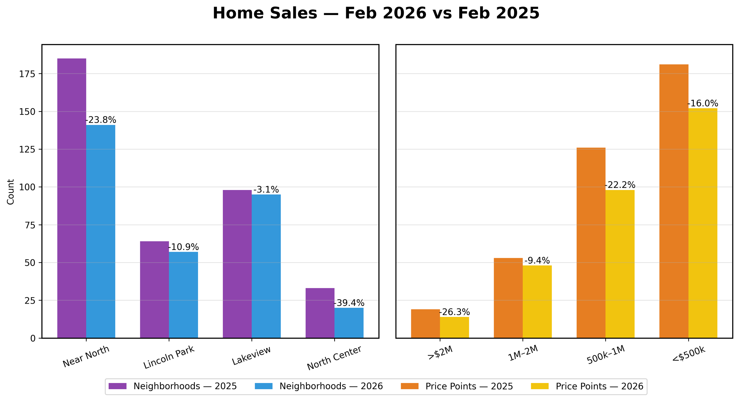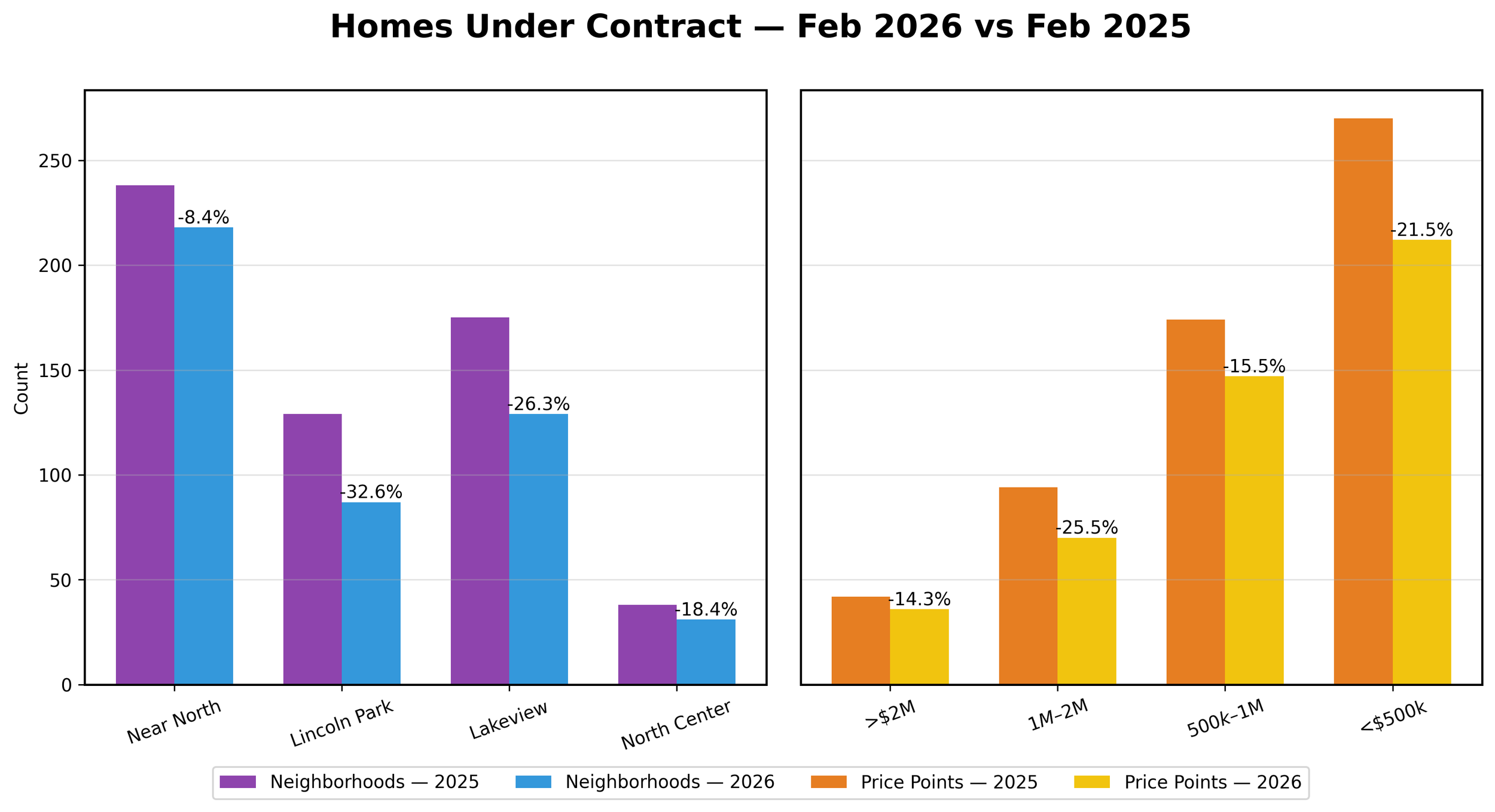 Most home sales that closed this month went under contract in a previous month. Units Under Contract reflects a more accurate picture of the current month, although not every home that goes under contract closes. February 2026 pending contracts declined across all segments, led by sharp drops in Lincoln Park and the $1M–$2M price band.